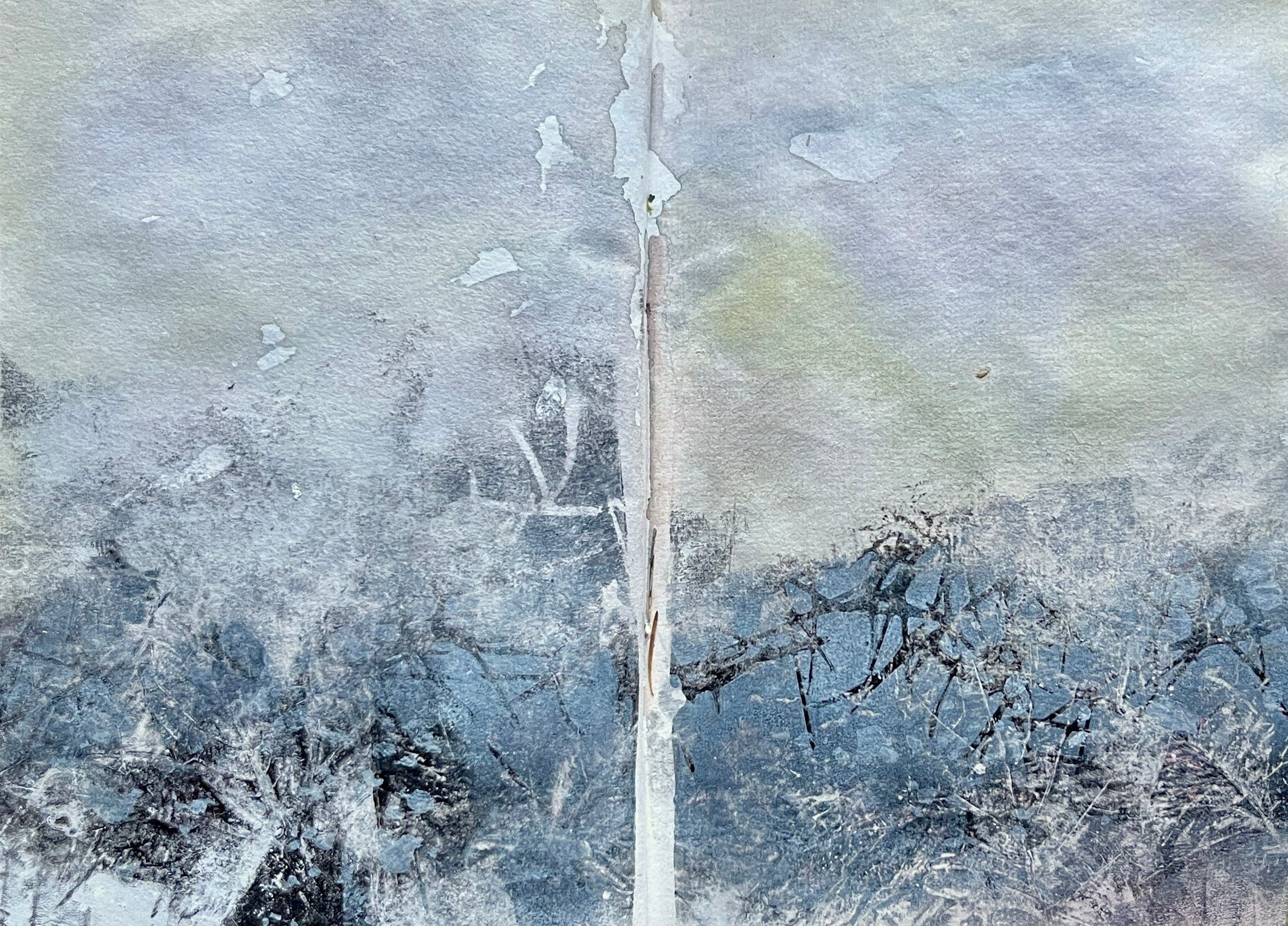 Sunday: The sky soft, the hills shrouded. Every so often a gasp of breath lifts from the snow fields. The mood carries onto the open page before the darkness of bare branches insinuates. Pages grow birch and pine, flecked with bronze and a little gold in memory of the lost leaves. Despite the rain, winter lingers in snow and ice; autumn has packed her bags and is closing the door.
